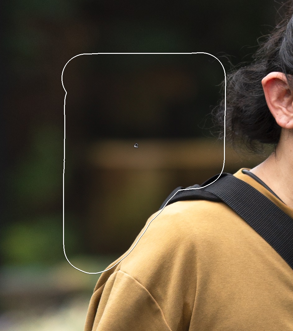 この削除ツール、自動レタッチ的な機能なのですが、なぜレタッチなのかというと、消して欲しいものと残してほしいものの境界線を勝手に「ここっすね~上手くやっときますね~」と良い塩梅でちょちょっとやってくれちゃうんです。よく見ると髪の毛もカバンの形状も肩の形もちょっと変わってしまっているんですが、削除後の写真だけ見たらまあ分かんないですよね。善悪は別として凄いなと思います。