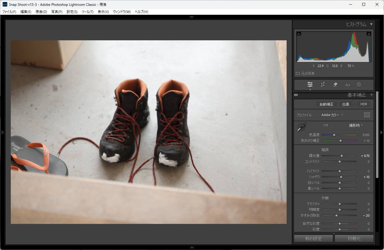 ですので、わたくしはLrで「かすみの除去-10、自然な彩度+25」というプリセットを作って当てることにしました。