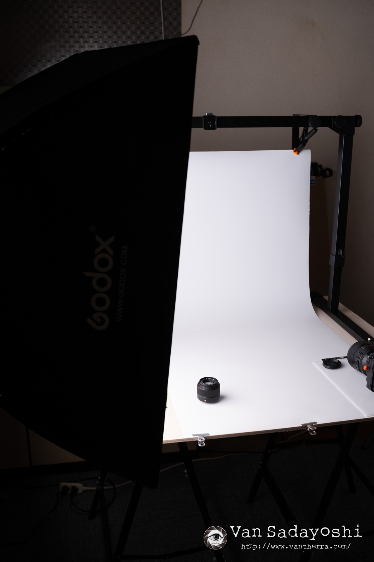 今回のセッティングは、皆さん同じようにできないとアレだと思うので、ソフトボックを撮影台の横に、面が垂直になるようにセッティングしています。これ真上から吊り天井状態にしようとしたりすると特殊なスタンドが必要になったりしますから、ソフトボックスは垂直に置いた状態でやってみましょう。